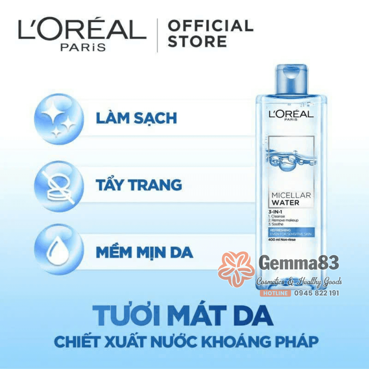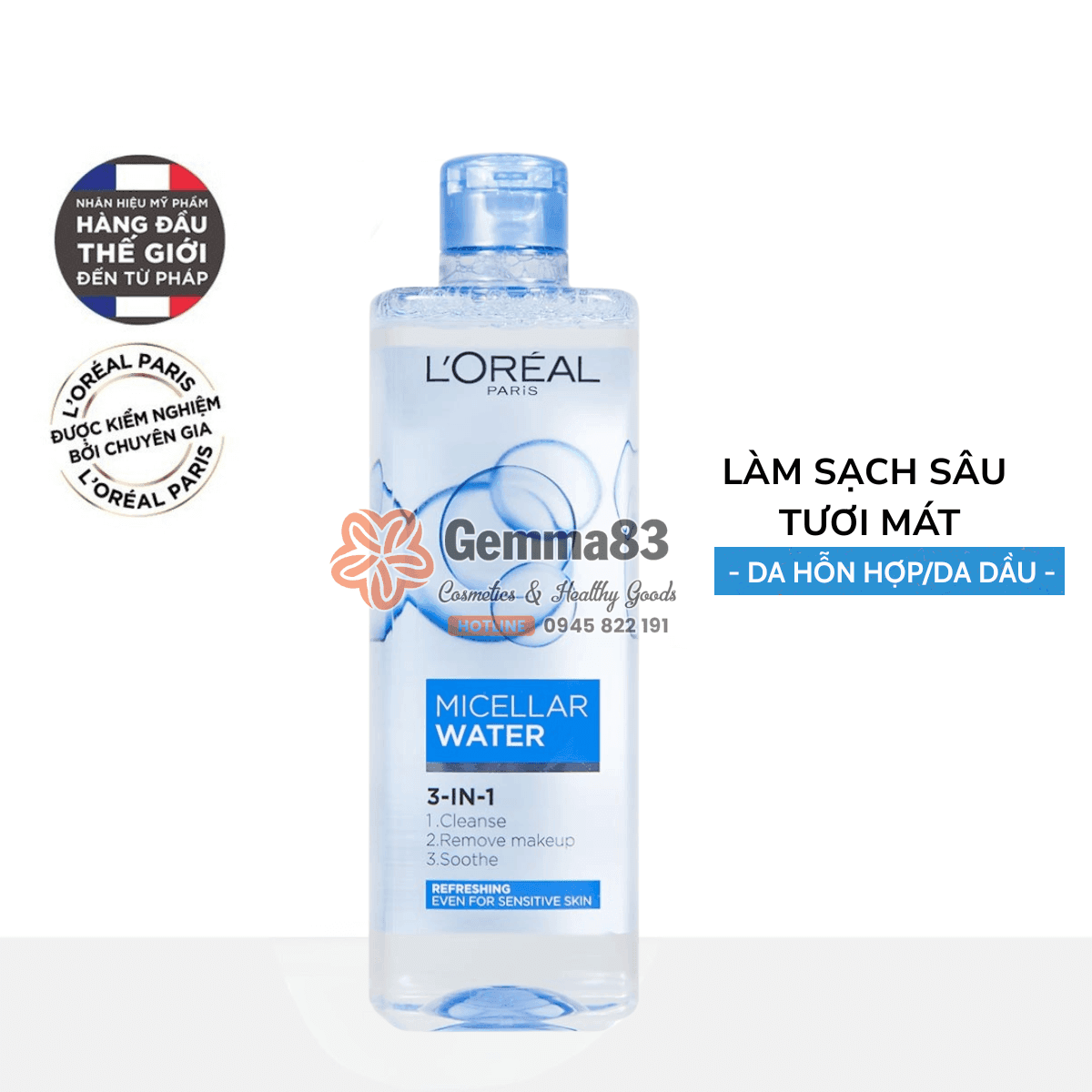 - L’Oréal Paris Micellar Water 3-in-1 Refreshing Even For Sensitive Skin (Xanh dương nhạt): Giúp làm sạch lớp trang điểm và làm tươi mát da. Dành cho da dầu/da hỗn hợp. Phù hợp với cả da nhạy cảm.
