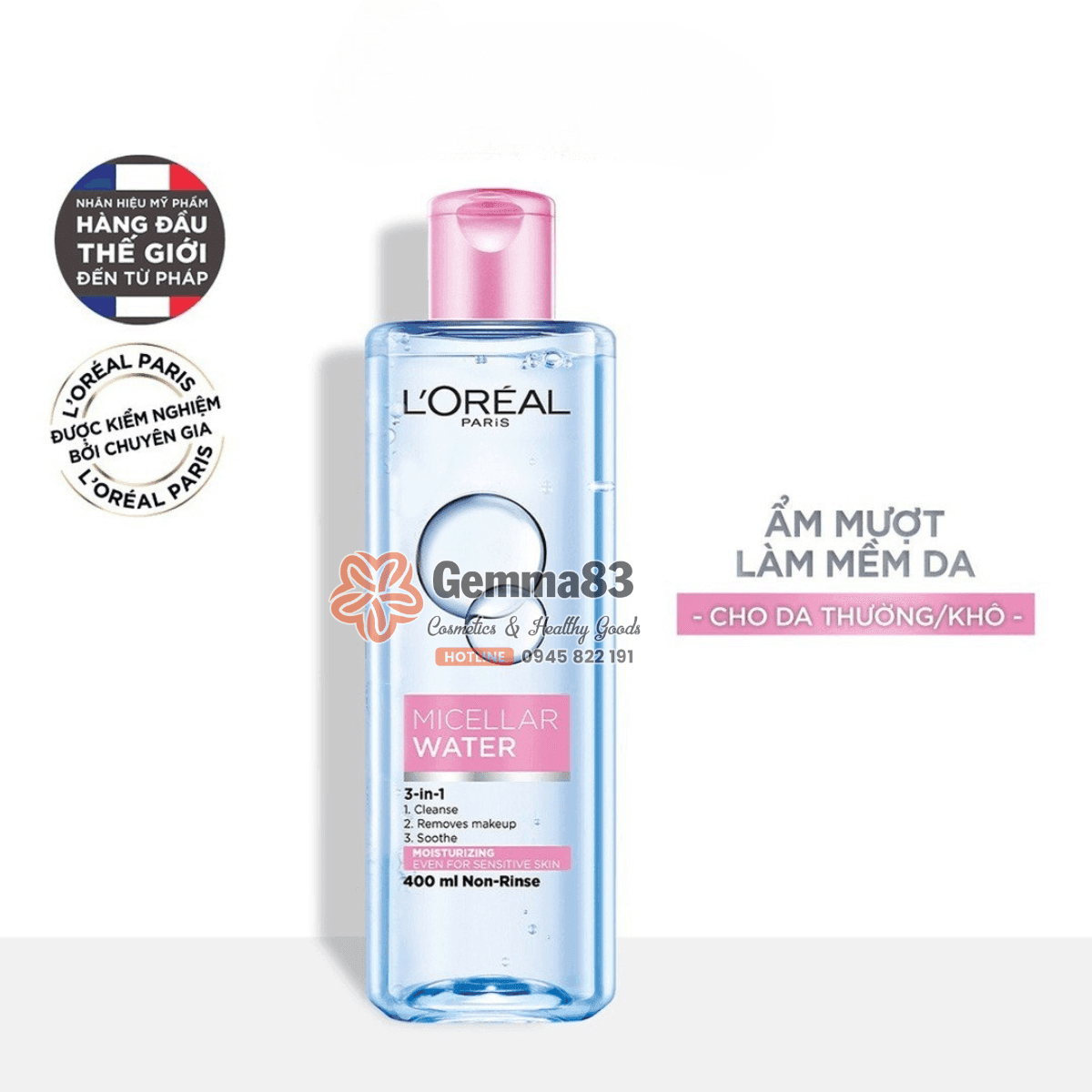 - L’Oréal Paris Micellar Water 3-in-1 Moisturizing Even For Sensitive Skin (Hồng): Giúp làm sạch lớp trang điểm và dưỡng ẩm da. Dành cho da thường/da khô. Phù hợp với cả da nhạy cảm.