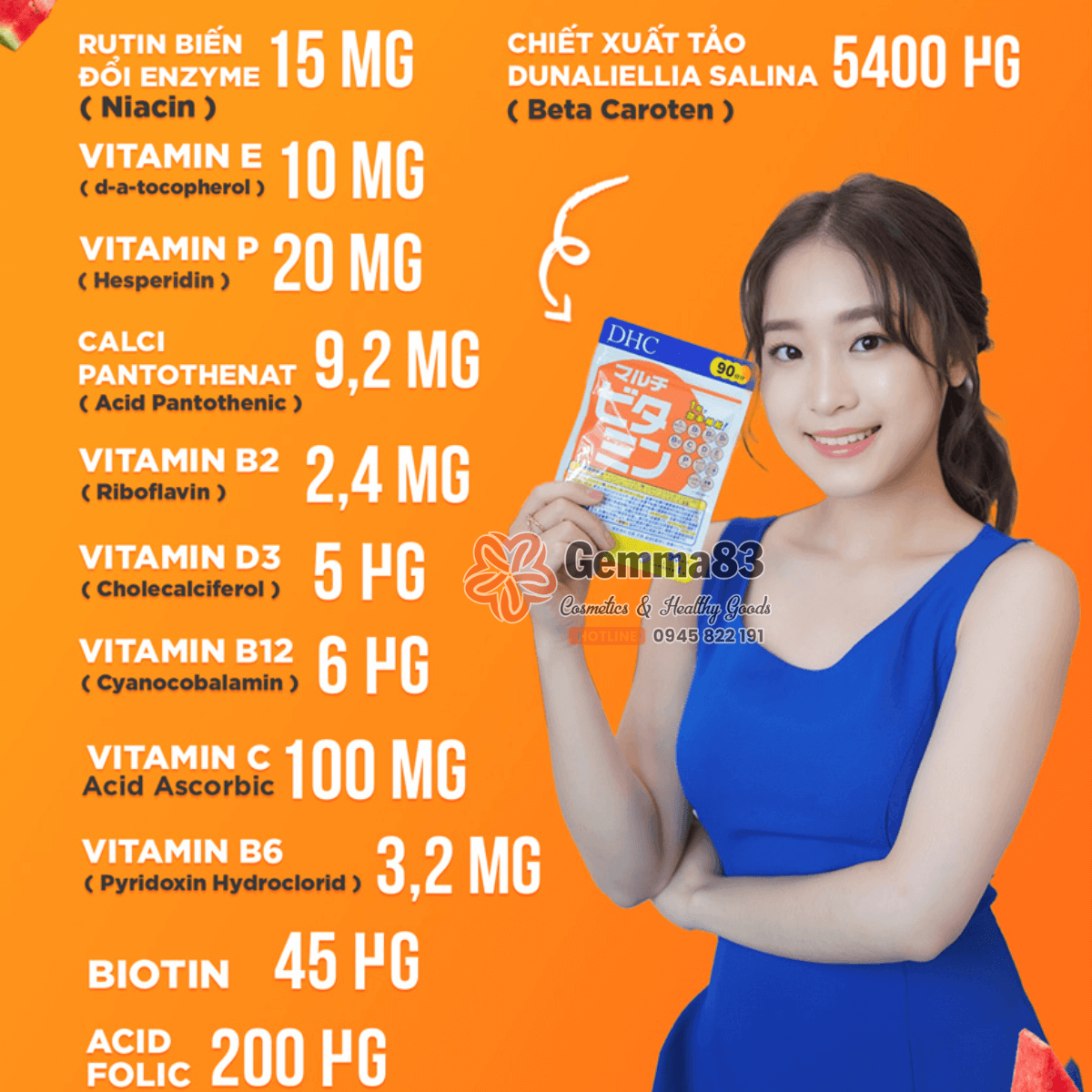 Mỗi viên uống DHC Multi Vitamin chứa đến 12 loại Vitamin thiết yếu, bao gồm β-carotene, B1, B2, B6, B12, C, D, E, Niacin, acid pantothenic, acid folic và Biotin. Với tỷ lệ phối trộn hợp lý, sản phẩm đặc biệt phù hợp cho những người dễ bị mất cân bằng dinh dưỡng, người ăn ít hoặc những ai sống vội vàng. Khi được hấp thụ vào cơ thể, các Vitamin này sẽ tham gia vào quá trình chuyển hóa, hỗ trợ phát triển toàn diện và duy trì sức khỏe, giúp bạn luôn tràn đầy năng lượng, vượt qua sự mệt mỏi và căng thẳng trong cuộc sống hàng ngày.